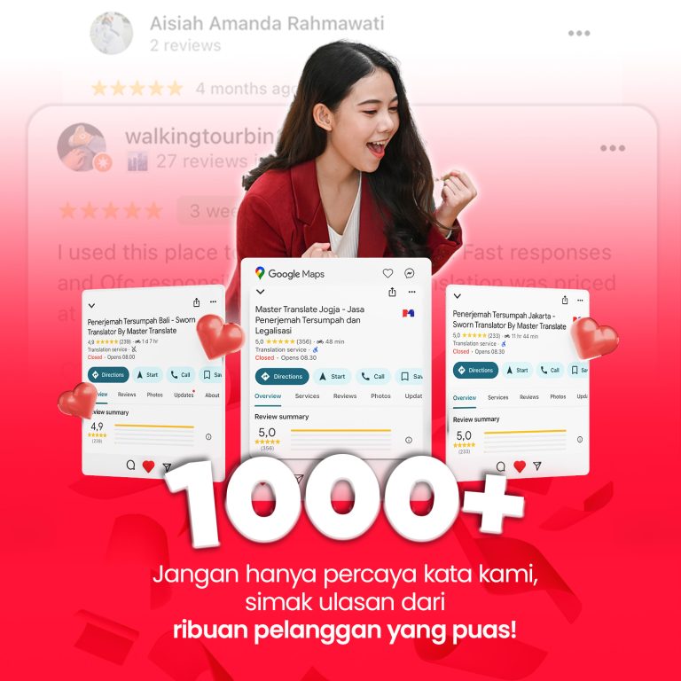 Penerjemah Tersumpah Jakarta - Sworn Translator By Master Translate 317 Google reviewsPosted on Aurora utara2025-10-08Trustindex verifies that the original source of the review is Google. Pelayanan ramah, dokumen 1 hari selesai dan untuk harga juga affordable. So far hasil terjemahan sesuai dan gaada typo 🙌🏻Posted on Sasa2025-10-08Trustindex verifies that the original source of the review is Google. Penerjemahnya benar-benar profesional dan teliti. Hasil terjemahannya akurat banget, gampang dipahami, dan tetap sesuai sama makna aslinya. Kerjanya juga cepat dan rapi. Pokoknya recommended banget!Posted on Anugrah Widodo2025-10-07Trustindex verifies that the original source of the review is Google. Mantab cepat dan murah serta Satset bgt..Posted on Wan Subrata2025-10-07Trustindex verifies that the original source of the review is Google. Service baik dan sangat cepat penanganannyaPosted on Maraya Yuli Indralia2025-10-07Trustindex verifies that the original source of the review is Google. Adminnya sangat ramah dan fast resp! Proses pengerjaan dokumen juga cepat dan sat set banget. Overall puas dan okay!! Thank you master translate 👍🏻👏🏻Posted on Y Darma2025-10-06Trustindex verifies that the original source of the review is Google. Terjemahan cepat 1 hari jadi dengan tarif yang terjangkauPosted on gupita sari2025-10-06Trustindex verifies that the original source of the review is Google. Patut dapat bintang 5+. Pelayanannya sangat sesuai harapan, ramah, efektif dan efisien. Timnya juga komunikatif. Terima kasih! Semoga sukses selalu.Posted on mia indah2025-10-06Trustindex verifies that the original source of the review is Google. Pelayanan baik dan cepatPosted on linda theresia2025-10-04Trustindex verifies that the original source of the review is Google. Proses sangat Cepat, Pelayanan memuaskan. Menjawab kebutuhan customer.Posted on Yulia Windyastuti2025-10-04Trustindex verifies that the original source of the review is Google. Cepat dan akurat 👍👍👍Verified by TrustindexTrustindex verified badge is the Universal Symbol of Trust. Only the greatest companies can get the verified badge who has a review score above 4.5, based on customer reviews over the past 12 months. Read more